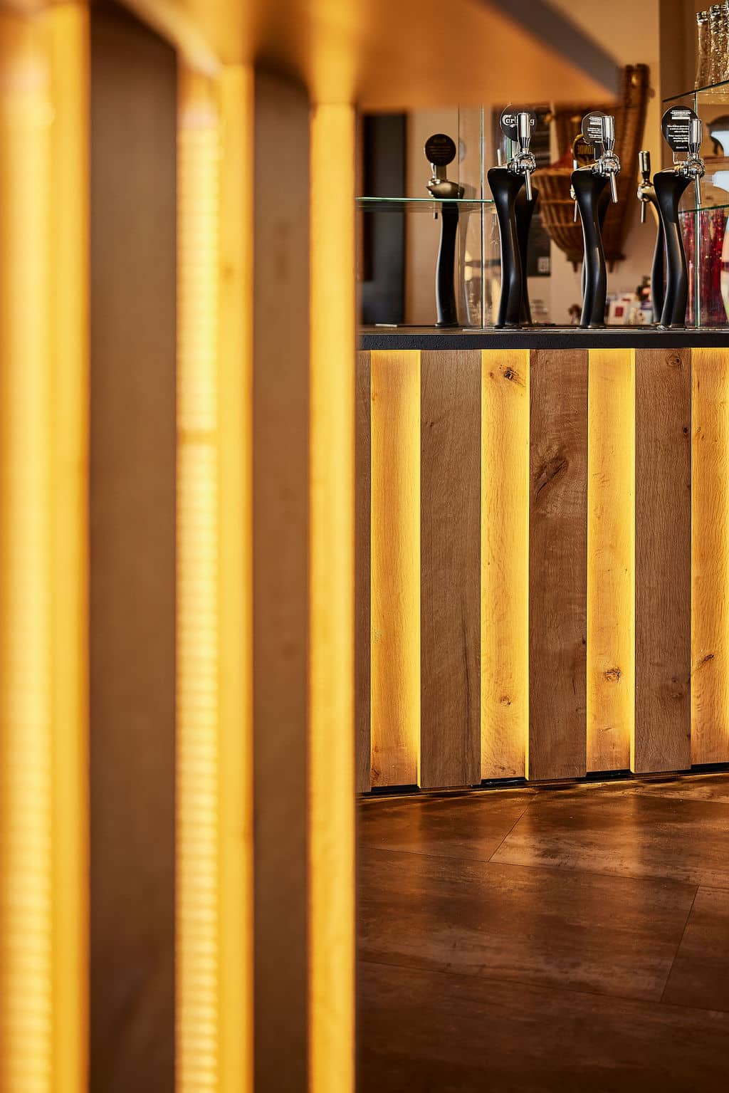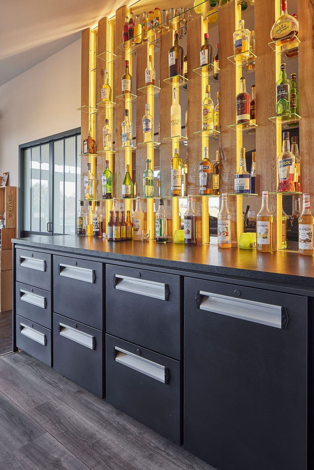 Notre équipe de menuisiers agenceurs a fabriqué l’intégralité du mobilier dans notre atelier de 2000 m² situé à La Chapelle-Saint-Luc, près de Troyes. Du comptoir de bar aux finitions du plafond, chaque élément a été réalisé sur mesure pour s’intégrer parfaitement à l’architecture existante.
