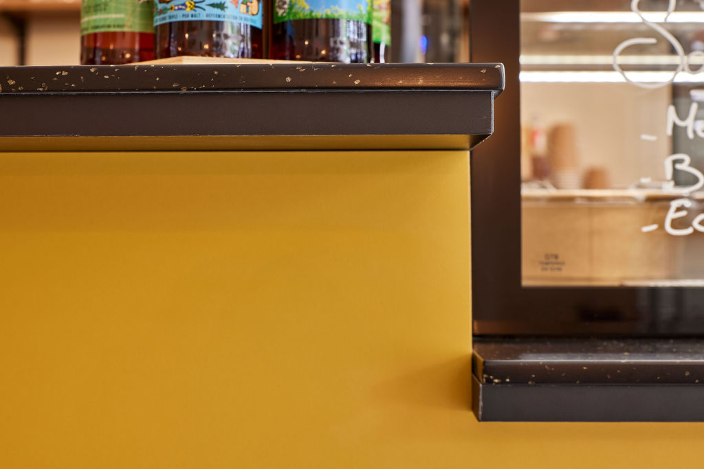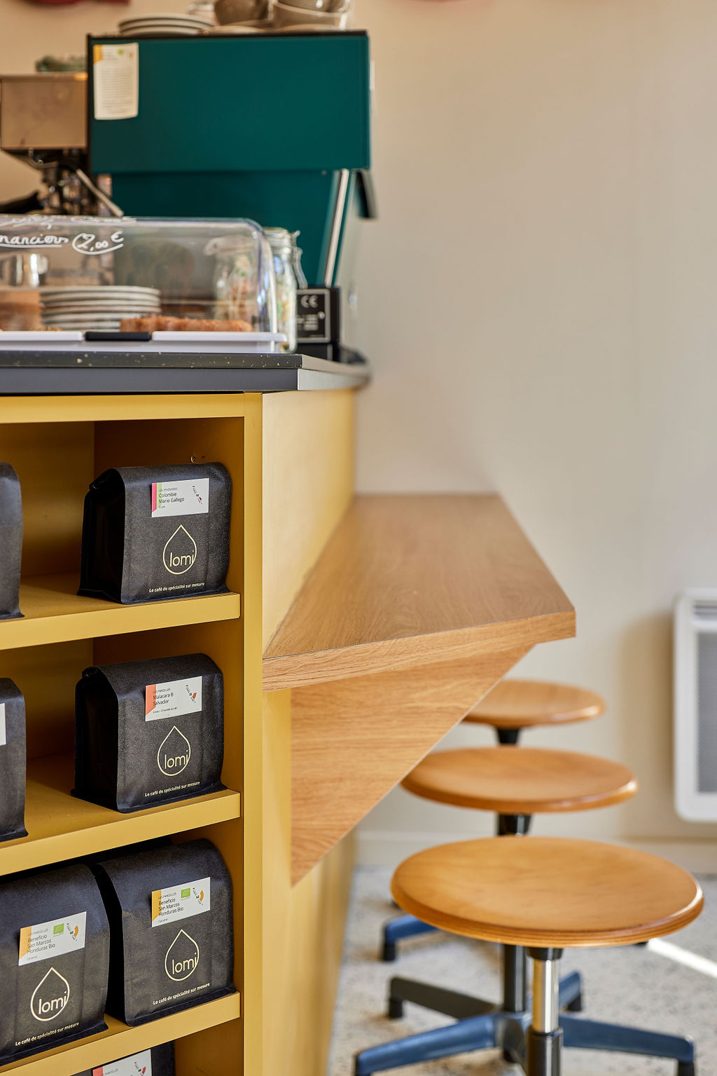 Fabriqué intégralement dans notre atelier de 2000 m² à La Chapelle-Saint-Luc, le mobilier du Kafé Paulette témoigne de notre expertise dans l’agencement de bars et restaurants.