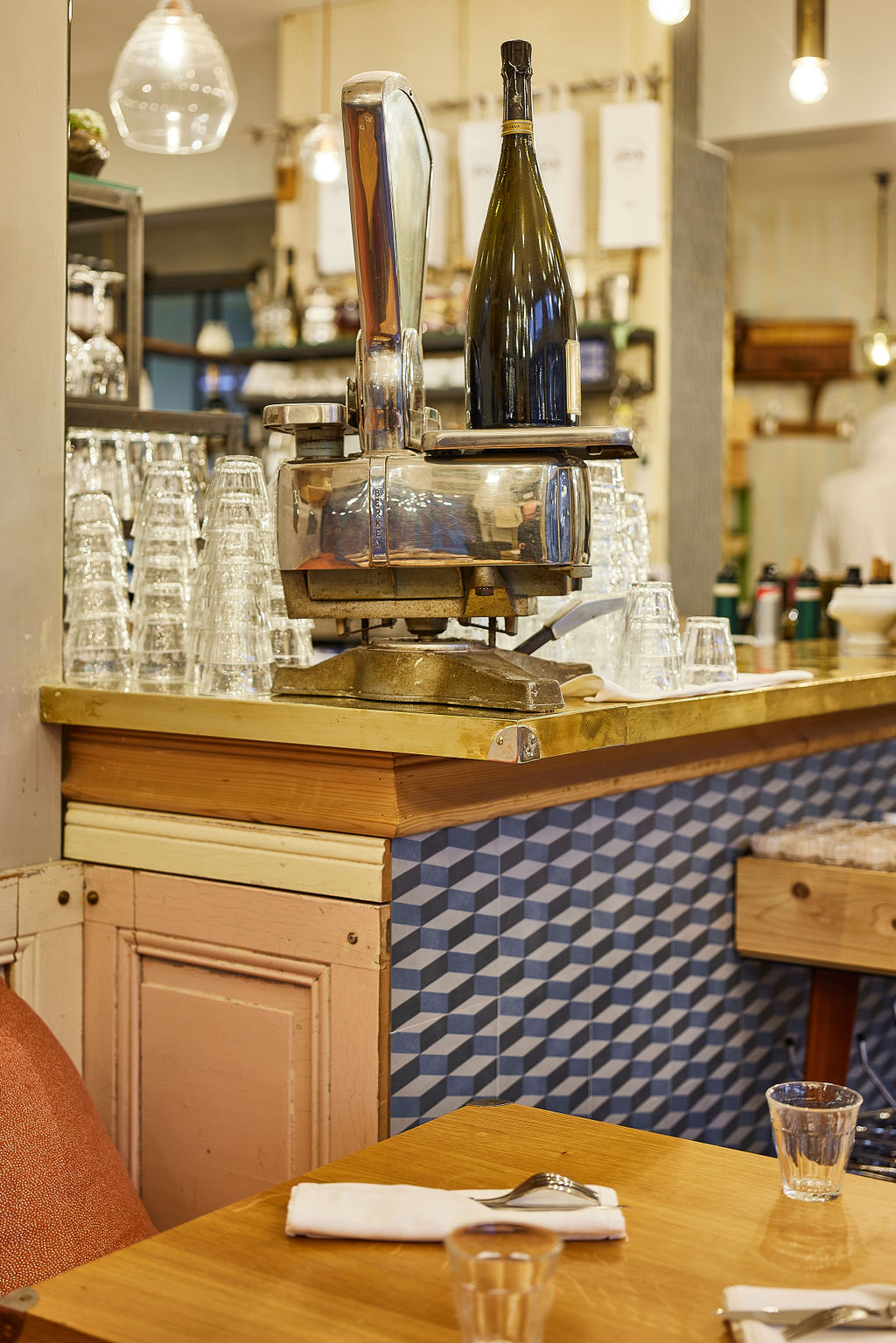 La conception de l’agencement de Chez Felix a été réalisée en collaboration avec le designer Glabeck. La pièce maîtresse : un bar arrière unique qui donne tout son caractère à l’établissement.