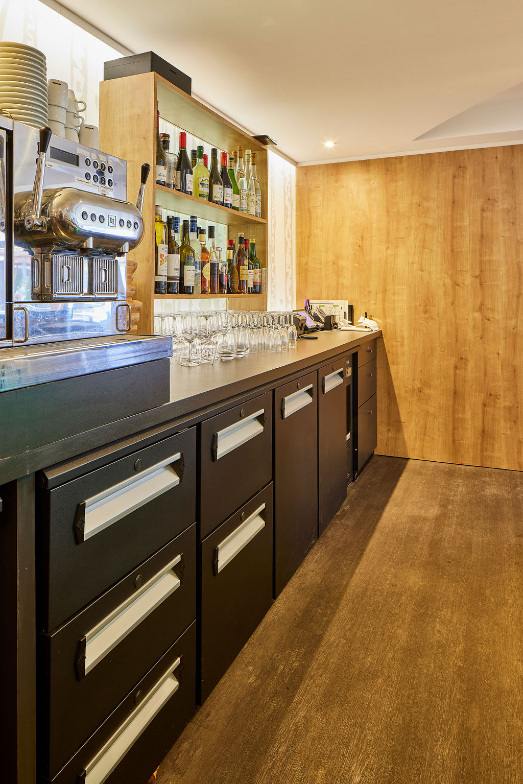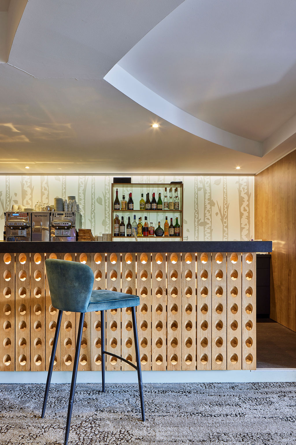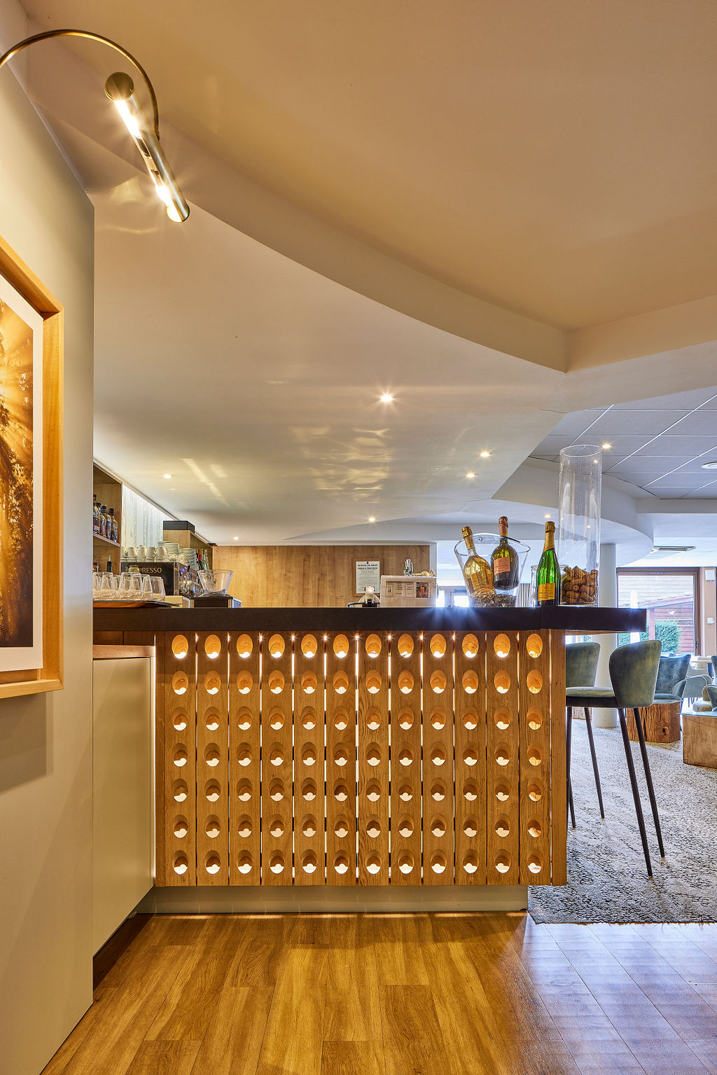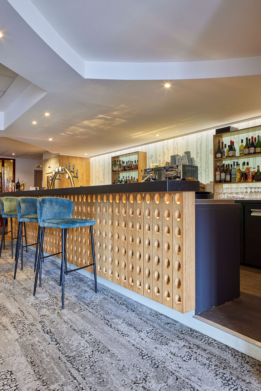 Le bar, conçu par notre bureau d’études, intègre les équipements professionnels nécessaires au service tout en offrant un espace de détente élégant pour les clients de l’hôtel.