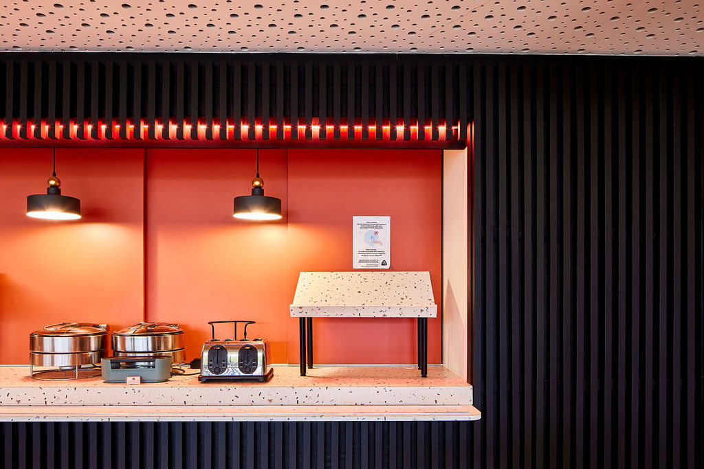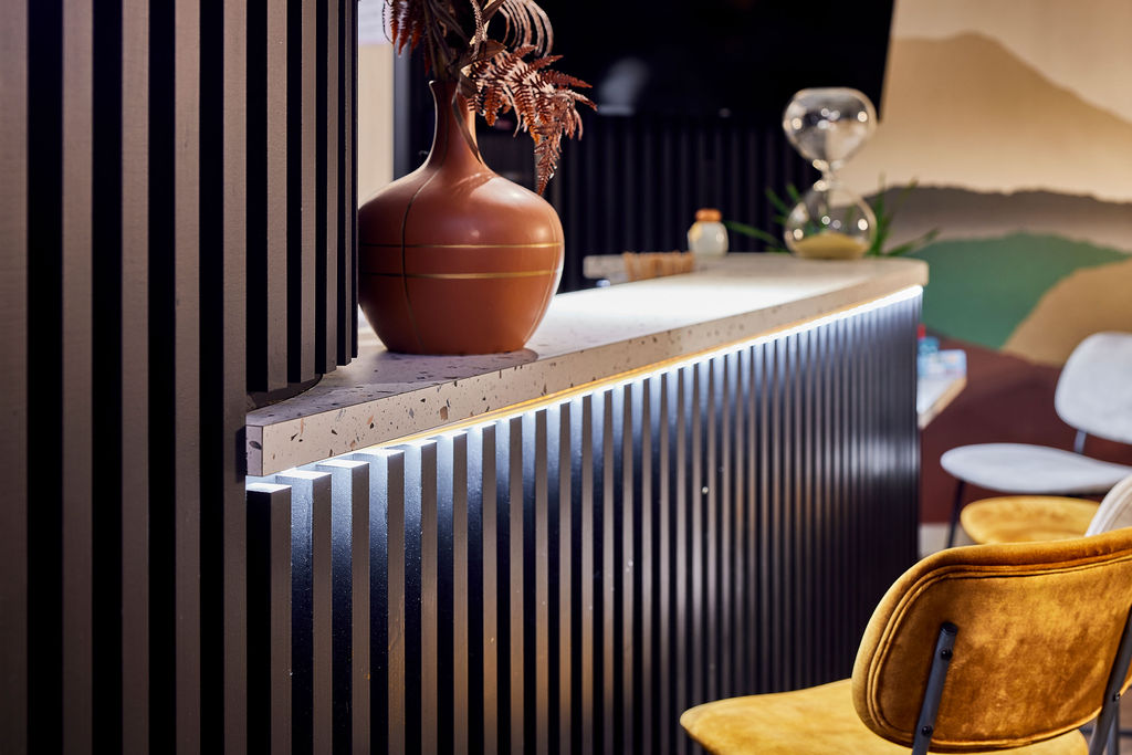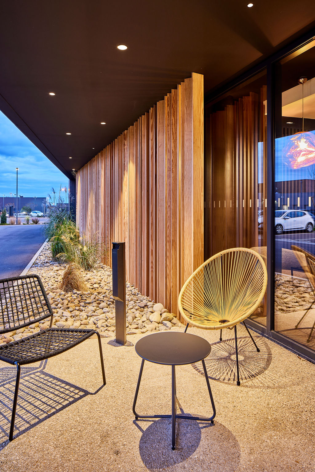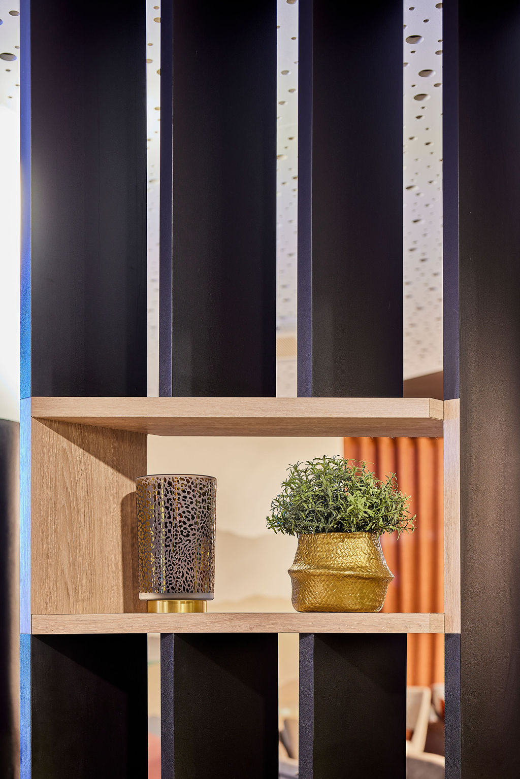 La conception de l'agencement de l'Hôtel AKENA, y compris la salle de réunion, le comptoir de réception et les claustras intérieurs et extérieurs, a été réalisée par CRD en collaboration avec l'architecte Corpelet Lykken. La sélection soigneuse des matériaux, des couleurs et des textures a permis de créer une ambiance unique pour chaque espace, tout en mettant en valeur l'atmosphère moderne de l'hôtel.